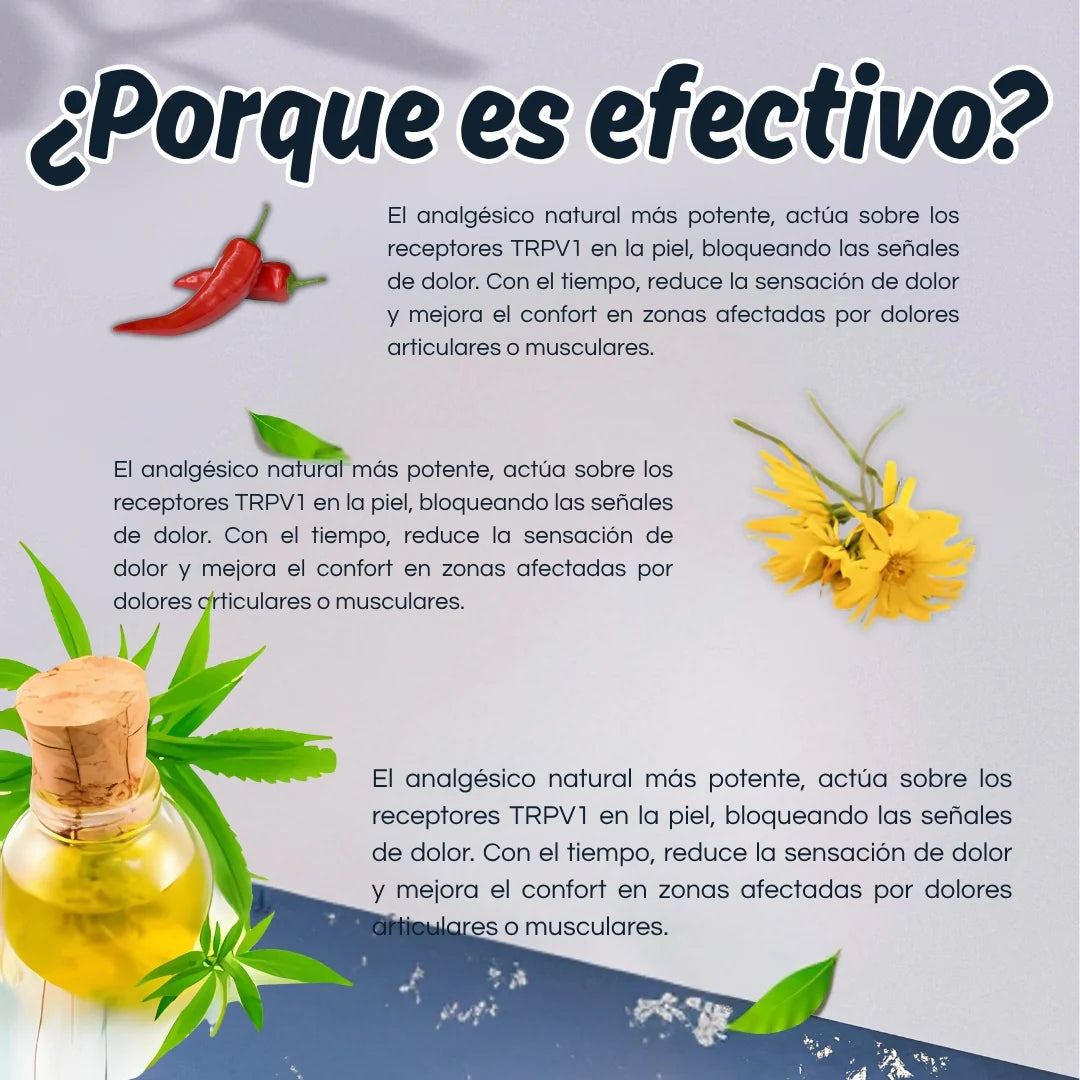 La capsaicina actúa bloqueando la transmisión del dolor, brindando un efecto analgésico casi inmediato.